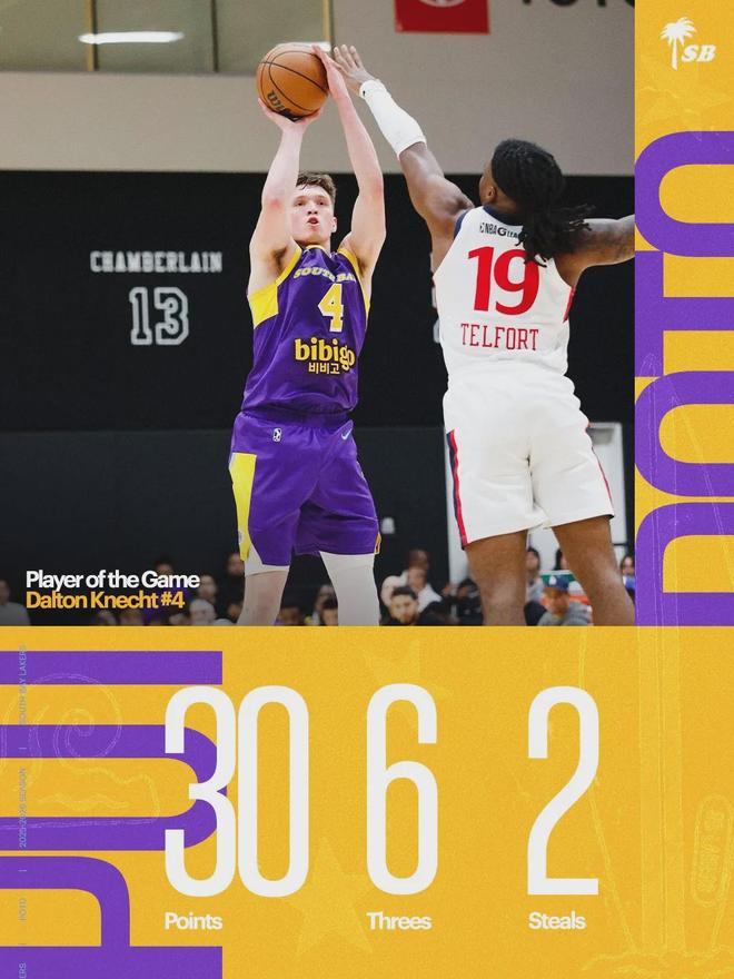 北京时间12月17日,NBA发展联盟比赛:南湾湖人127-118战胜圣迭戈快船。布朗尼5投2中,三分3中0,得到4分3板3助4失误;克内克特迎来发展联盟首秀:17投10中,三分10中6,罚球3中3,狂砍30分5篮板2助攻2抢断1盖帽!