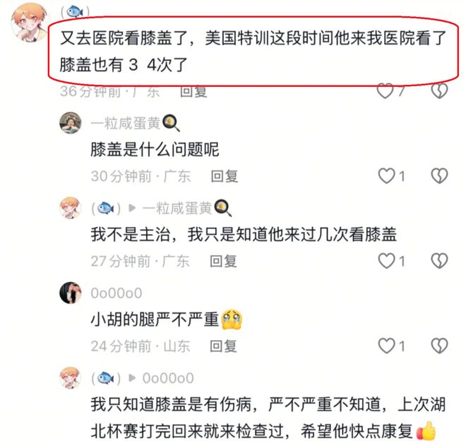 根据最新消息了解,胡明轩在打完与浙江队的比赛之后,他和队医又来到医院进行检查和治疗,原因就是他的膝盖伤又复发了。