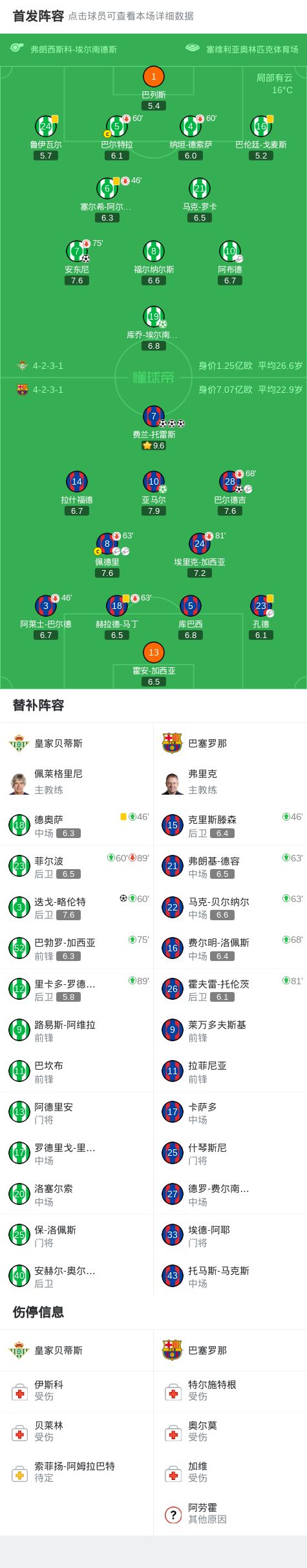 帽子戏法,费兰-托雷斯当选贝蒂斯vs巴萨全场最佳球员